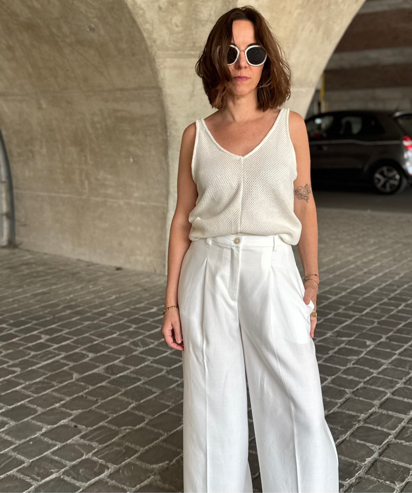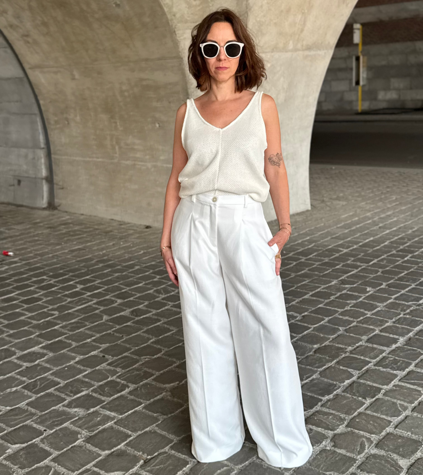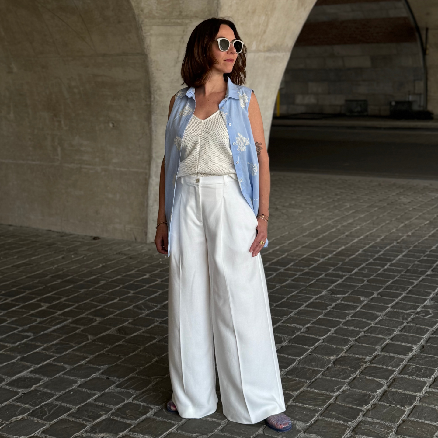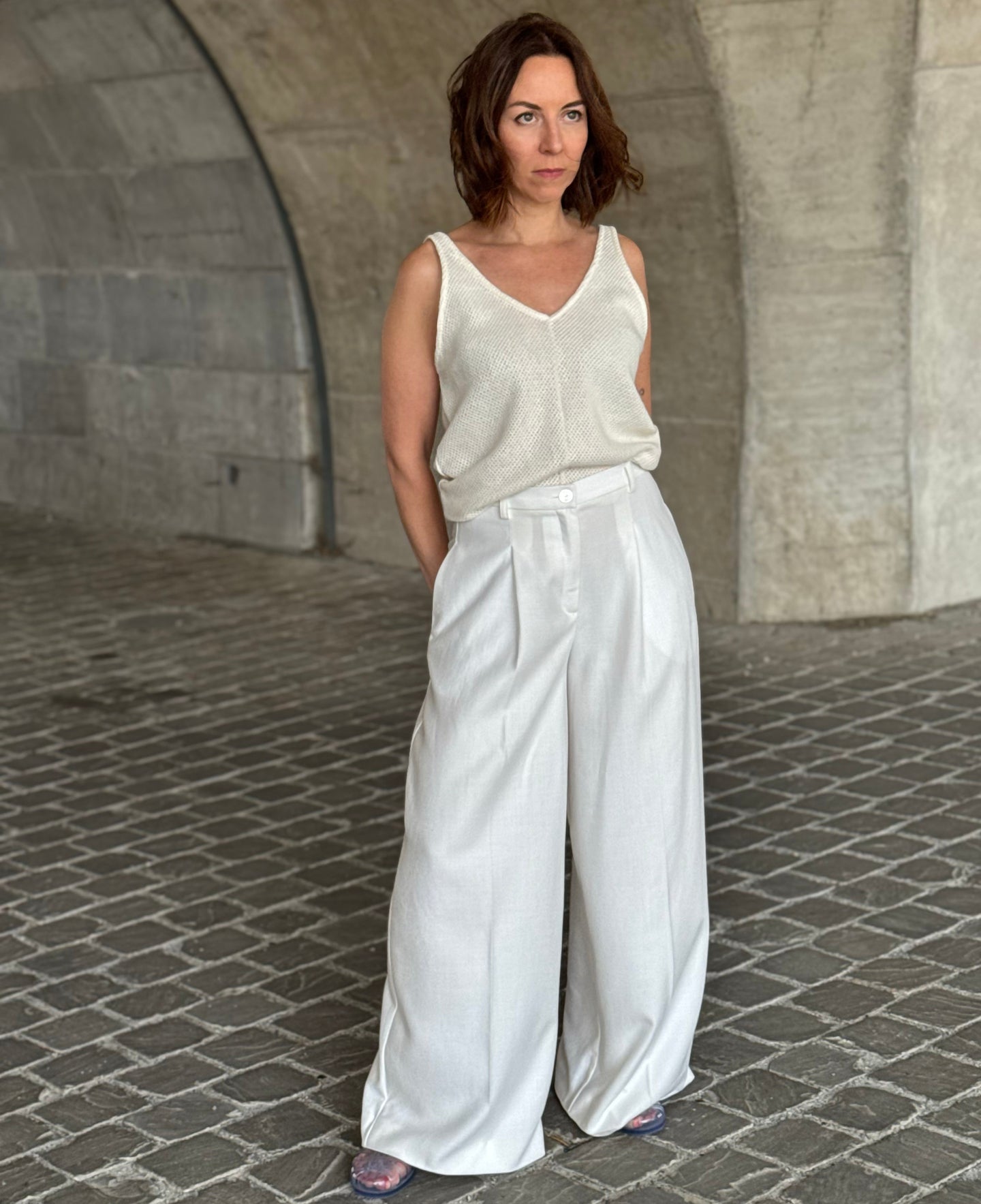 Woman wearing wide-leg pants standing on a stone pavement.