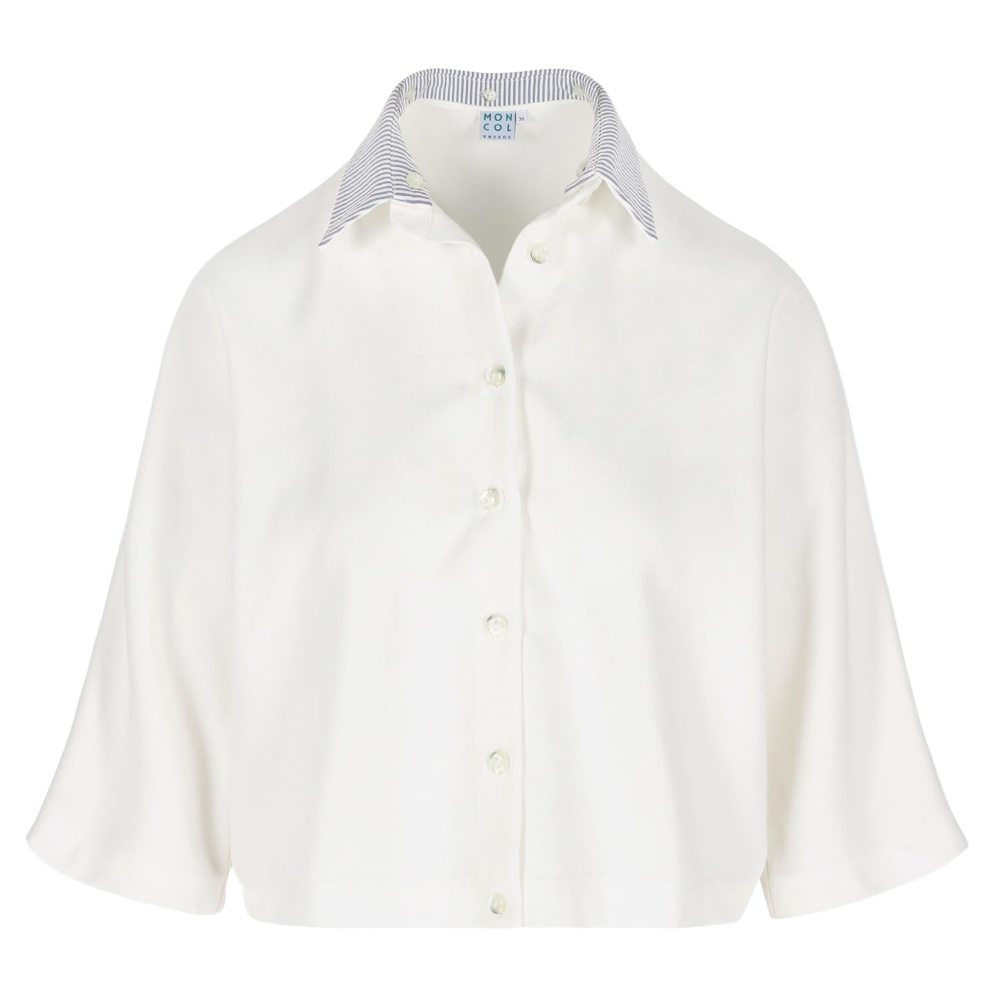 Discover the Umber blouse Panna, a versatile piece made from sustainable off-white lyocell with 3/4 sleeves. The blouse has a distinctive removable and reversible collar featuring light denim lyocell on the reverse side. Button it for a tailored silhouette or wear it unbuttoned as a refined layering piece. The Umber blouse pairs effortlessly with the Clio pants or layers beautifully over the Iggy dress.