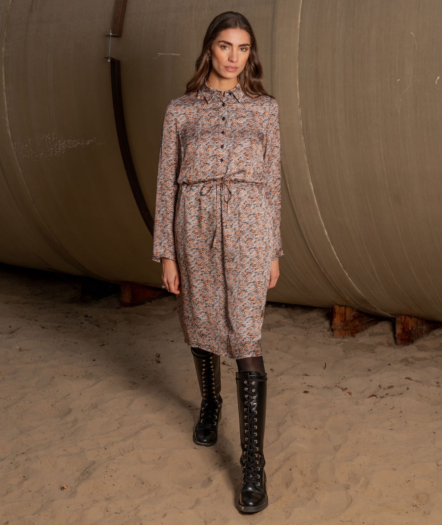 This  dress is made in an EcoVero viscose with a water print in navy and orange. The dress has a tunnel in the waist, pockets and a reversible and removable collar. The reverse side of the collar is made in a navy viscose.