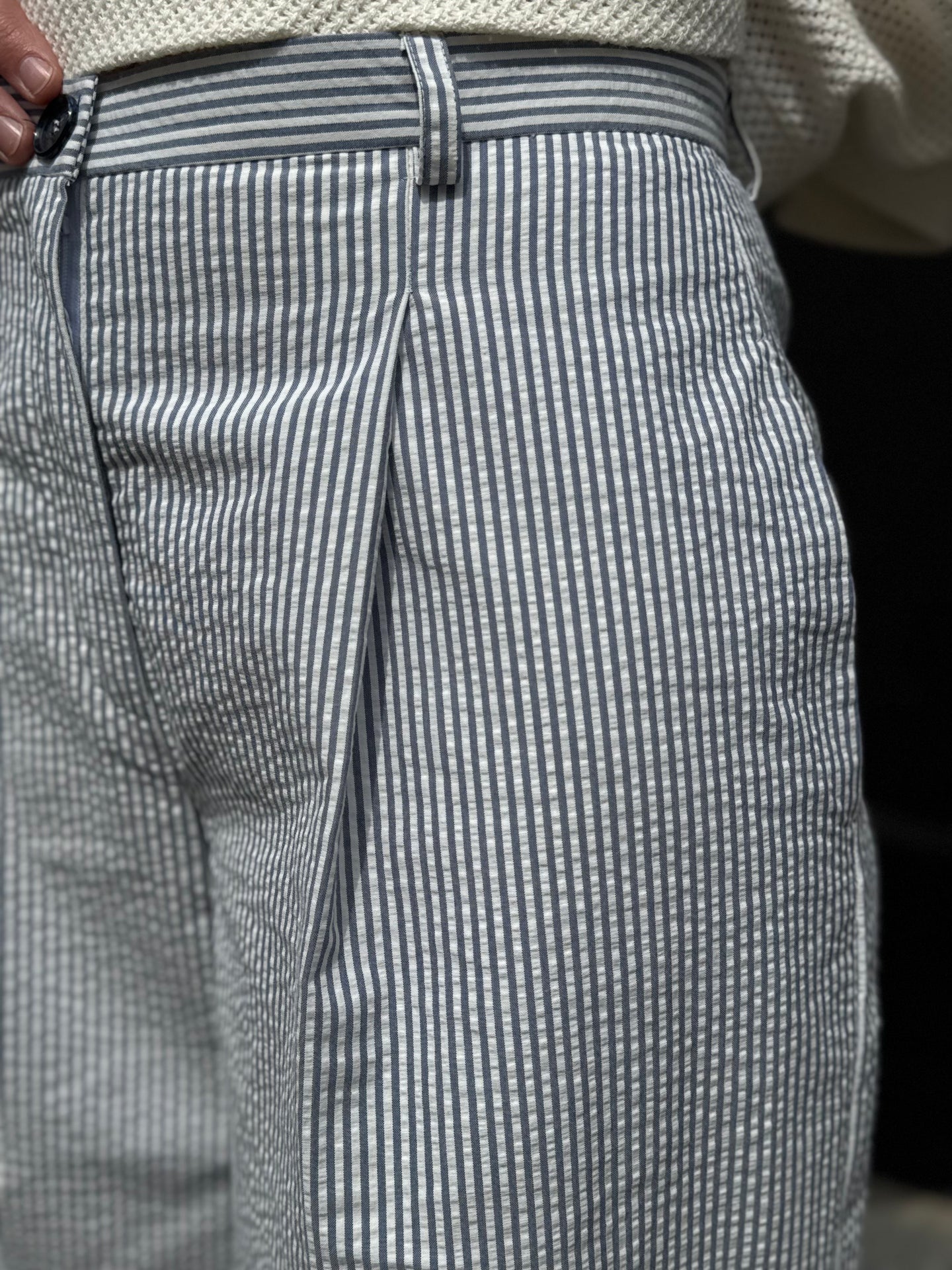 These Clio pants are designed with a wide leg and functional pockets for a sleek yet practical look. Made in seersucker, they offer both style and comfort for all-day wear. Perfect for any occasion, these pants are a must-have addition to your wardrobe. You can match the with the Candy blouse Blue stone or the Umber blouse Panna.